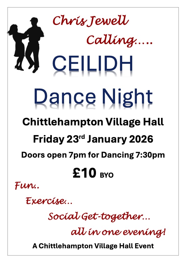 | Fri 23 Jan 26 | 7:30pm to 10:30pm (doors open 7pm) | Ceilidh | Zoe Nicklin | zoecnicklin@outlook.com | +441769540867 |